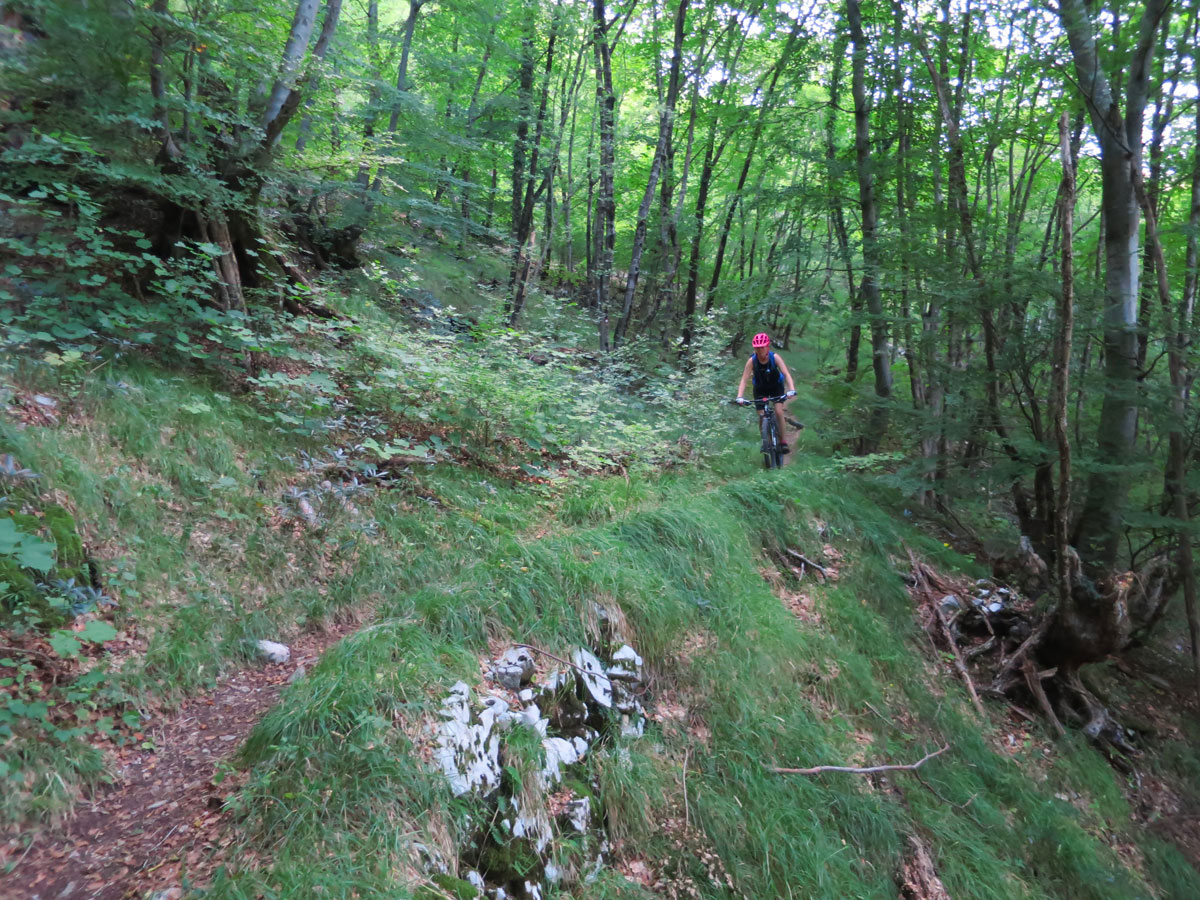 Iz Mošćenićke Drage sva zavila proti Mošćenici in naprej do Svete Jelene. Na vrhu klanca je križišče in smerokaz za kolesarsko pot št. 8. Teh oznak sva se držala do vrha grebena, kjer sva zavila levo in skočila do bližnjega vrha Brgud, še prej pa sva se ustavila pri lovski koči Perun. Tukaj sva srečala prijaznega pastirja z ogromno čredo ovac. Nato sva se vrnila do istega križišča in nadaljevala po najširšem makedamu, ki vodi po planoti in se počasi odvija po severni strani Učke. Namesto, da bi šla na Malo Učko, sva zavila desno po ožji planinski poti proti Mošćenicam in se spustila do vasi Petrebišća. Ostanki stanov pričajo o bogatem življenju v starih časih. Na poti sva srečala prijazne konje. Potem sva se spustila po takšnih in drugačnih single trailih in nadaljevala proti kamniti vasi Trebišća. Ozka pot naju je vodila do še ene vasi, nato pa se je spojila z asfaltno cesto, ki naju je pripeljala nazaj do izhodišča. Spust je zame v povprečju zahteven, celotna pot pa dolga in kondicijsko zahtevnejša.