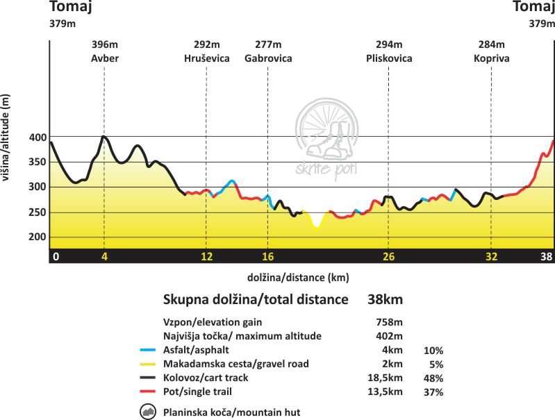 | Čas trajanja: 6 h | Dolžina: 38 km | Vzpon: 758 m |