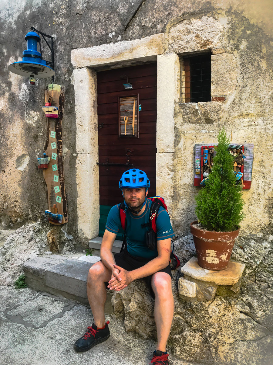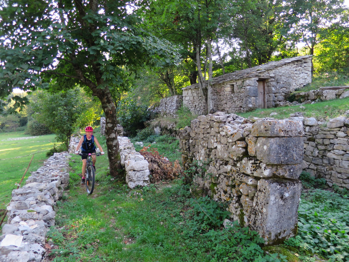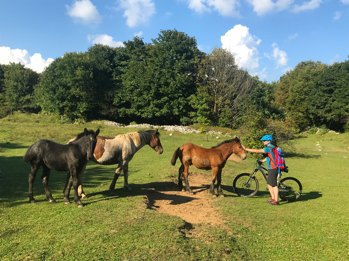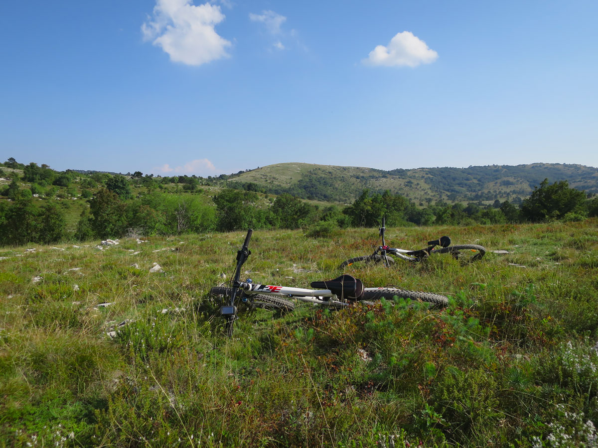 Iz Mošćenićke Drage sva zavila proti Mošćenici in naprej do Svete Jelene. Na vrhu klanca je križišče in smerokaz za kolesarsko pot št. 8. Teh oznak sva se držala do vrha grebena, kjer sva zavila levo in skočila do bližnjega vrha Brgud, še prej pa sva se ustavila pri lovski koči Perun. Tukaj sva srečala prijaznega pastirja z ogromno čredo ovac. Nato sva se vrnila do istega križišča in nadaljevala po najširšem makedamu, ki vodi po planoti in se počasi odvija po severni strani Učke. Namesto, da bi šla na Malo Učko, sva zavila desno po ožji planinski poti proti Mošćenicam in se spustila do vasi Petrebišća. Ostanki stanov pričajo o bogatem življenju v starih časih. Na poti sva srečala prijazne konje. Potem sva se spustila po takšnih in drugačnih single trailih in nadaljevala proti kamniti vasi Trebišća. Ozka pot naju je vodila do še ene vasi, nato pa se je spojila z asfaltno cesto, ki naju je pripeljala nazaj do izhodišča. Spust je zame v povprečju zahteven, celotna pot pa dolga in kondicijsko zahtevnejša.