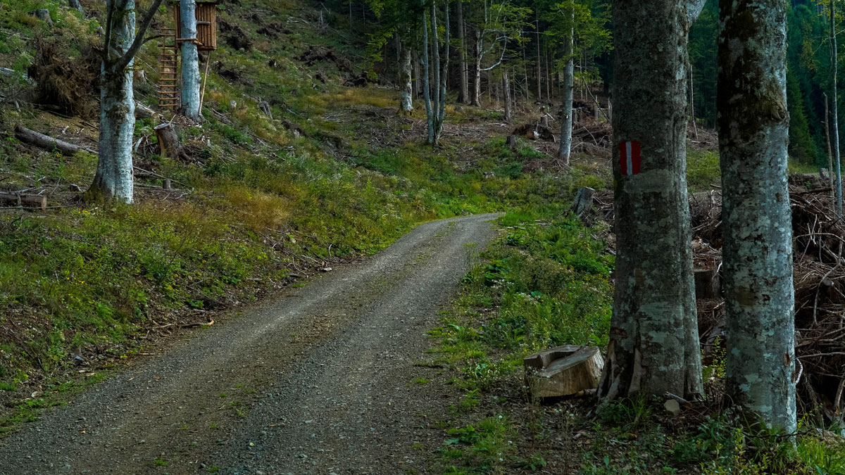 Štartal sem pod kmetijo Kumer in jo mahnil proti planini Luže, vendar ne direktno po makadamski cesti. Desno malo višje vzporedno pelje lepo speljana cesta čez smrekov gozd. Mimo Riepla sem se povzpel na Topico in se spustili na Veglovo trato (1345 m). Tako kot na vrh Topice je tudi tik pod vrh Ojstre speljana gozdna cesta. Zadnji del vzpona na Ojstro sem opravil brez kolesa, saj je dokaj strm, vendar je steza zelo domiselno speljana v okljukih. Razgled na Ojstri je še bolj imeniten od tistega s Topice, saj je bolj odprt in vidiš na vse strani. Vidimo lahko Peco, Podjuno, Raduho, Olševo, Grintovce in Košuto. Spustim se mimo Peršmana in začnem dolg vzpon proti visokogorskemu napajališču Jeklova luža tik pod Mozganom (1483 m). Tu čez teče državna meja, nekdanja »železna zavesa«. To je star prehod čez gorski greben imenovan tudi sedlo Luža. Nadaljujem mimo Jelenovega vrha po stari kmečki tovorni poti do 900 let stare gotske cerkve Sv. Ane z oltarjem Črne Marije. Cerkev stoji na Jelenovem dvorišču, ki je pokrito z gosto pokošeno travo. Sredi dvorišča pa kraljuje stoletna lipa. Nadaljujem do kmetije Kumer, ki leži na nadmorski višini 1230 m, tik pod 2. najvišjo slovensko kmetijo Jekl. Pot je dolga, lepa in slikovita, vzponi so dolgi in strm, vendar si nagrajen s prečudovitimi razgledi.