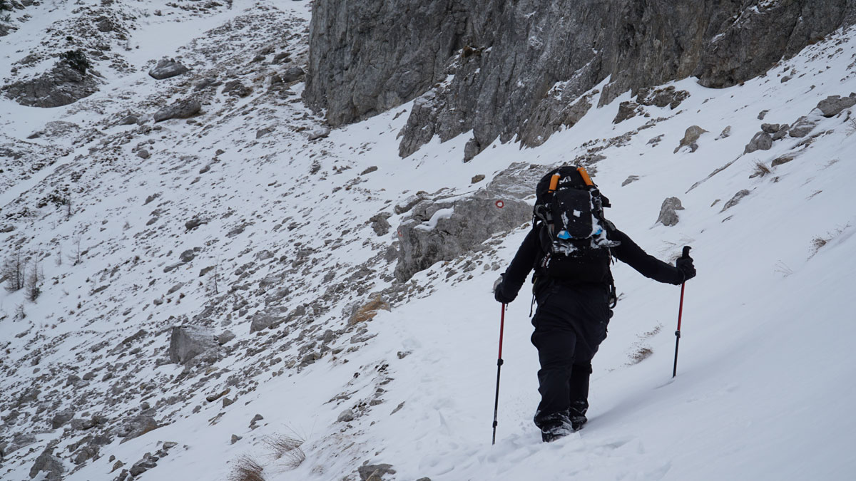 Ker nisva poznala razmer na severni strani Raduhe, sva s sabo vzela tudi čelado, dereze in cepin.