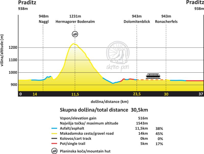 | Čas trajanja: 7 h | Dolžina: 37 km | Vzpon: 516 m |