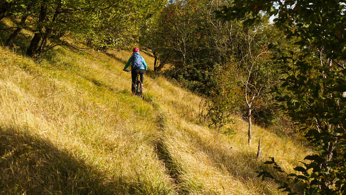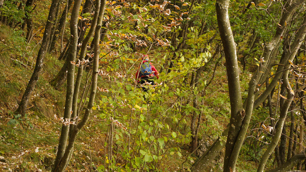 Posebnost te ture je v tem, da spust predstavlja 10 km dolgo prečenje po Srednječavenski oz. Bošnarski stezi, ki so jo včasih koristili lovci, gozdarji/logarji in lastniki parcel na južnem pobočju Čavenskega pogorja. Višinska razlika poti je le 200 m. Prečenje večinoma poteka po zelo ozki izpostavljeni poti, na nekaterih odsekih precej skalnati, zato je zahtevnost spusta višja, a precej adrenalinska. Zame je bil spust malo preveč zahteven, za fanta pa eden boljših v teh koncih. Na več točkah se preči izpostavljena melišča. Ker gre za kraški svet, nas lahko na vrhu preseneti zelo močan veter – zato previdno.