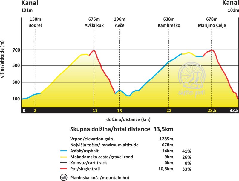 Od izhodišča se po cesti vrneva v Kanal, čez most proti naselju Bodrež. Kmalu zavijeva na zložno makadamsko pot, ki naju pripelje do akumulacijskega jezera ČHE Avče, kjer si privoščiva kratek počitek. Sledi kratek spust in vzpon po lepem trailu na vrh Avškega Kuka. Sledi spust v Avče po Soča Flow trailu. V Avčah se usmeriva za Kambreško. Vzpon do tam je po asfaltirani cesti. Do cerkve na Ligu greva po vzporednih poteh, makadamu in mulatjerah. Spust po trailu Marijino Celje – Soča ni preveč zahteven. Večkrat prečka glavno cesto na Lig. V spodnjem delu greva skozi Park Pečno, kjer se lahko na kratko ustavite in si ga ogledate. Na koncu naju pot pelje skozi tunel pod glavno cesto in pripelje skoraj do izhodišča. Še manjši vzpon in konec.